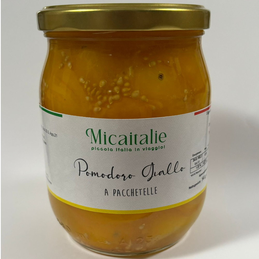 Le Pacchetelle di Pomodorino Giallo del Vesuvio sono un’eccellenza della tradizione campana, realizzate con i rinomati pomodorini coltivati sulle pendici del Vesuvio. Tagliati a metà e conservati in modo naturale, questi pomodorini mantengono intatto tutto il loro sapore unico: dolce e intenso, con un leggero retrogusto acidulo. Ideali per preparare sughi, pizze gourmet o piatti che richiedono ingredienti di alta qualità, le Pacchetelle offrono una vera esplosione di gusto e autenticità, trasportando in ogni boccone i profumi e i sapori del territorio vulcanico campano.