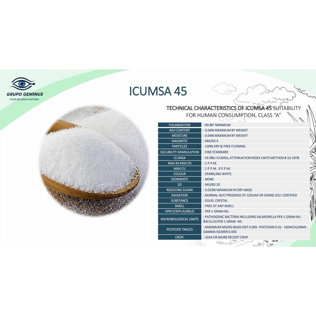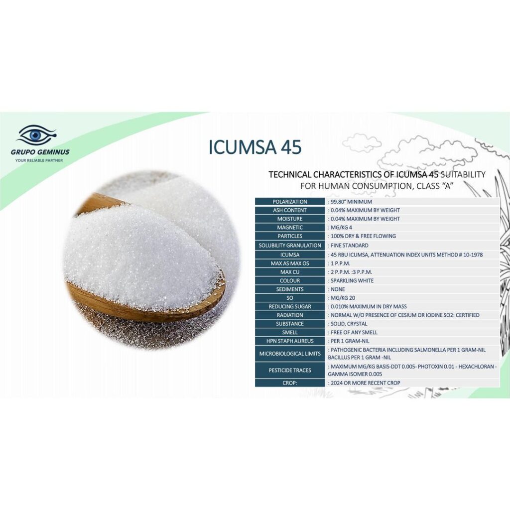 • Refined white sugar ICUMSA 45 (polarization 99.8%, moisture ≤ 0.04%, ash ≤ 0.04%).